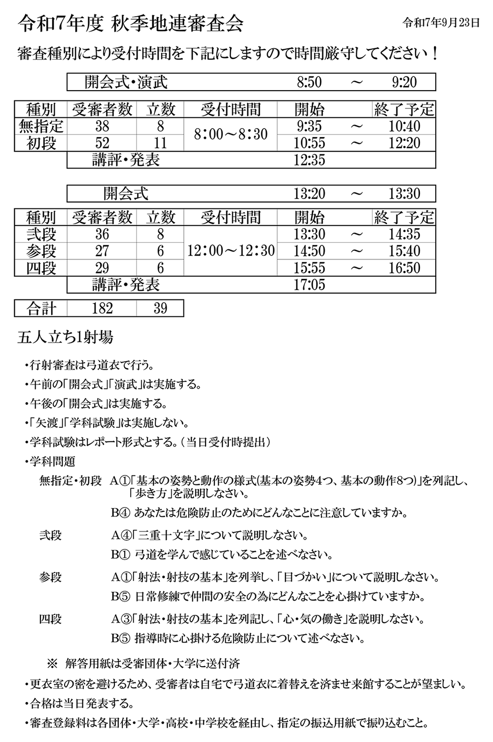 • 令和7年度 秋季地連審査会(9月23日)の時間割(受付時間)