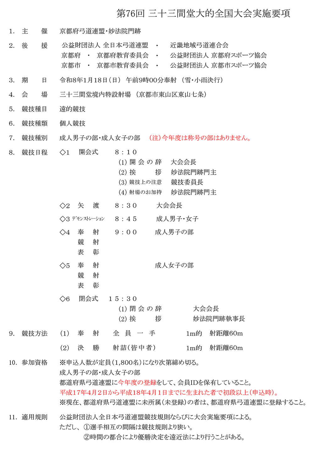 • 第76回三十三間堂大的全国大会実施要項を掲載しました。