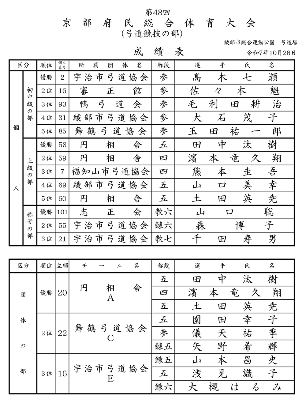令和7年度 京都府民総合体育大会の結果